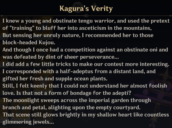 She once met the young and stubborn Kujou Tengu, tricked her into training in the mountains, and recommended her to the Kujou family. She once competed with the determined Oni, though defeated by Arataki Itto's extraordinary perseverance, she added some fun too the competition with a little trick. She exchanged goods with Liyue's Ganyu, gifting her delicious and tender seaweed. She also watched over all beings, pacified the diturbances caused by the mischievous Oni, and subtly played tricks on the pirate Linzang who harassed the islands, and hoped that the indestructible Scaramouche could find the right path.