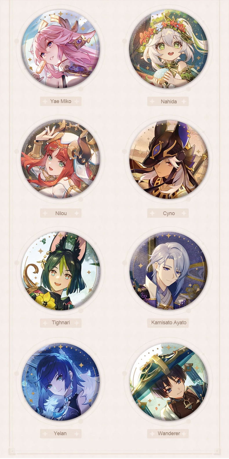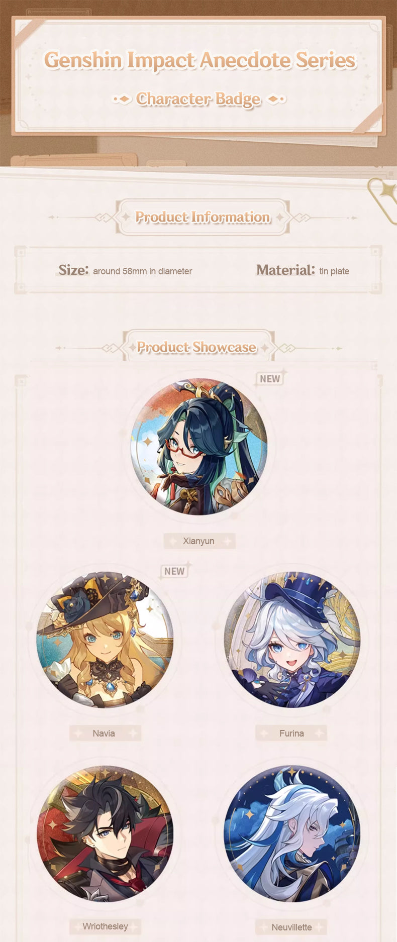 Beautiful metal badges from the "Anecdote" series feature characters like Navia, Wanderer, Yelan, Yae Miko, Nilou, and more, capturing the unique traits of each character in their official introduction arts from the game.