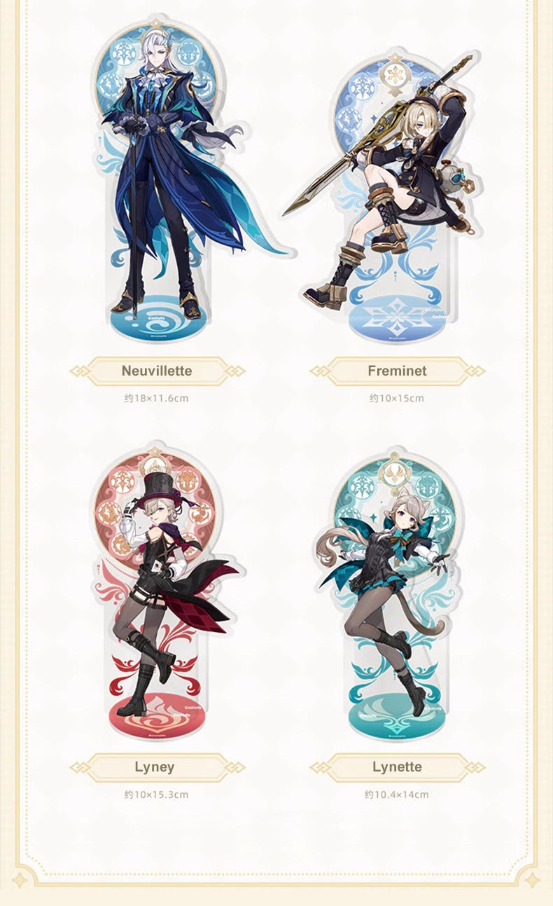 The official Genshin Impact Fontaine character acrylic stands, including Furina, Neuvillette, Wriothesley, Lyney, Lynette, and Freminet, will be available soon!these standees showcase clear and detailed character designs. Perfect for decorating your desk or shelf, choose your favorite character and join the magical Fontaine adventure!