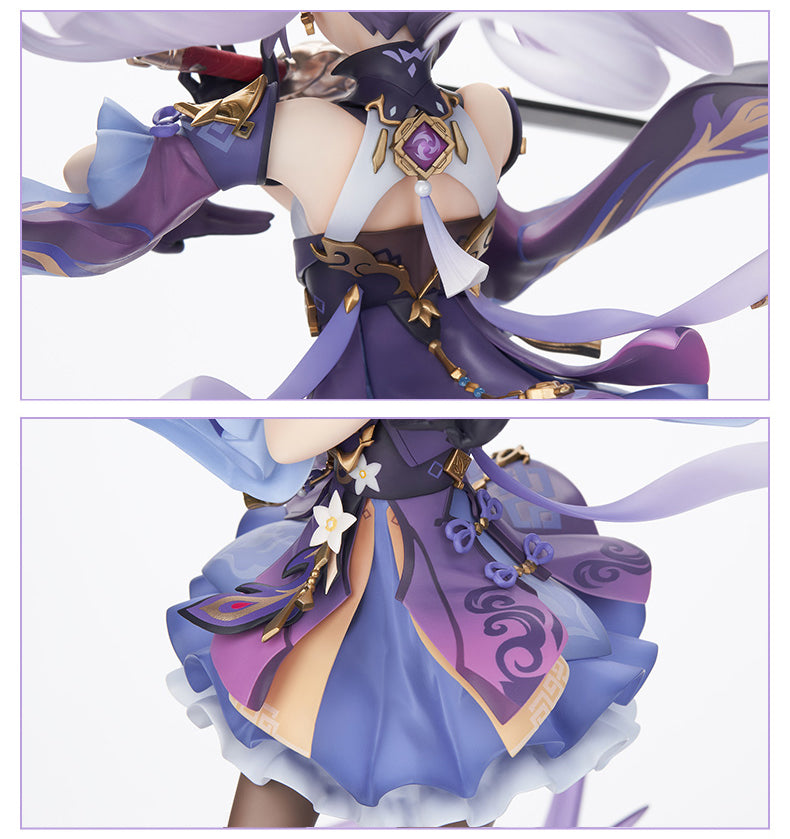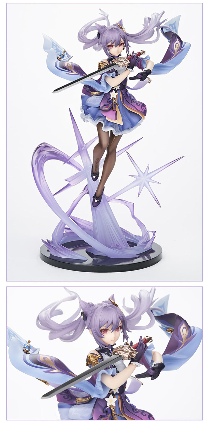 The Keqing Driving Thunder Ver. 1/7 Scale Figure stands at an approximate height of 32 centimeters. As a beloved Electro character within the game, Keqing wields the 'Lion's Roar' sword, her flowing indigo hair, and billowing sleeves adorned with intricate patterns. Under her short skirt, she wears long stockings, while beneath her feet, ethereal, semi-transparent thunder and lightning effects come to life. The sword's hilt boasts metallic paint, and her Vision gleams with a semi-transparent material.