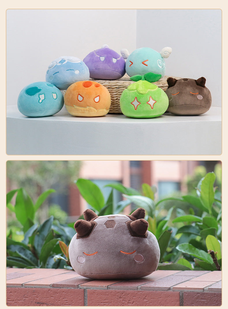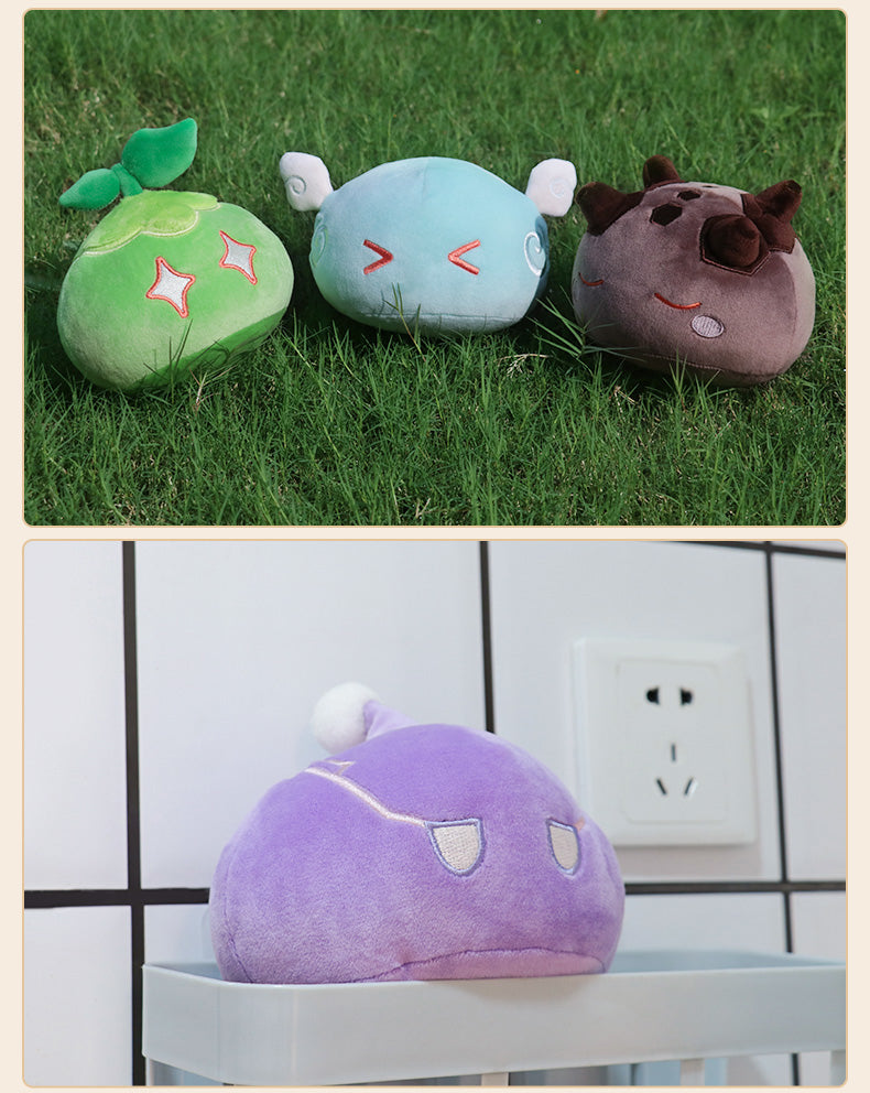Cute plush toys from the Slime family,each with unique elemental powers, and their expressions hint at the distinct personalities of the Seven Gods in Genshin Impact, These toys make for incredibly adorable decorations for your home or car.