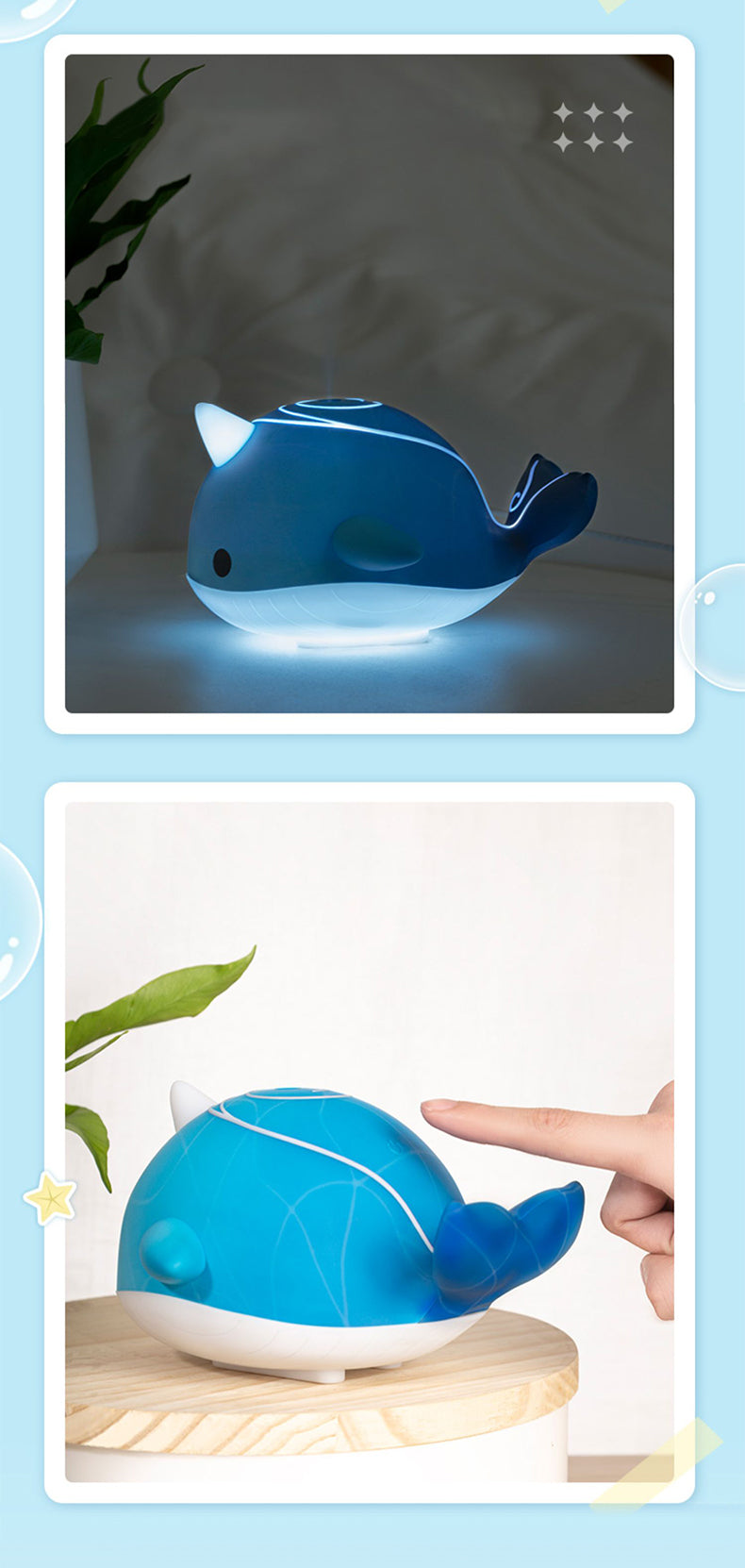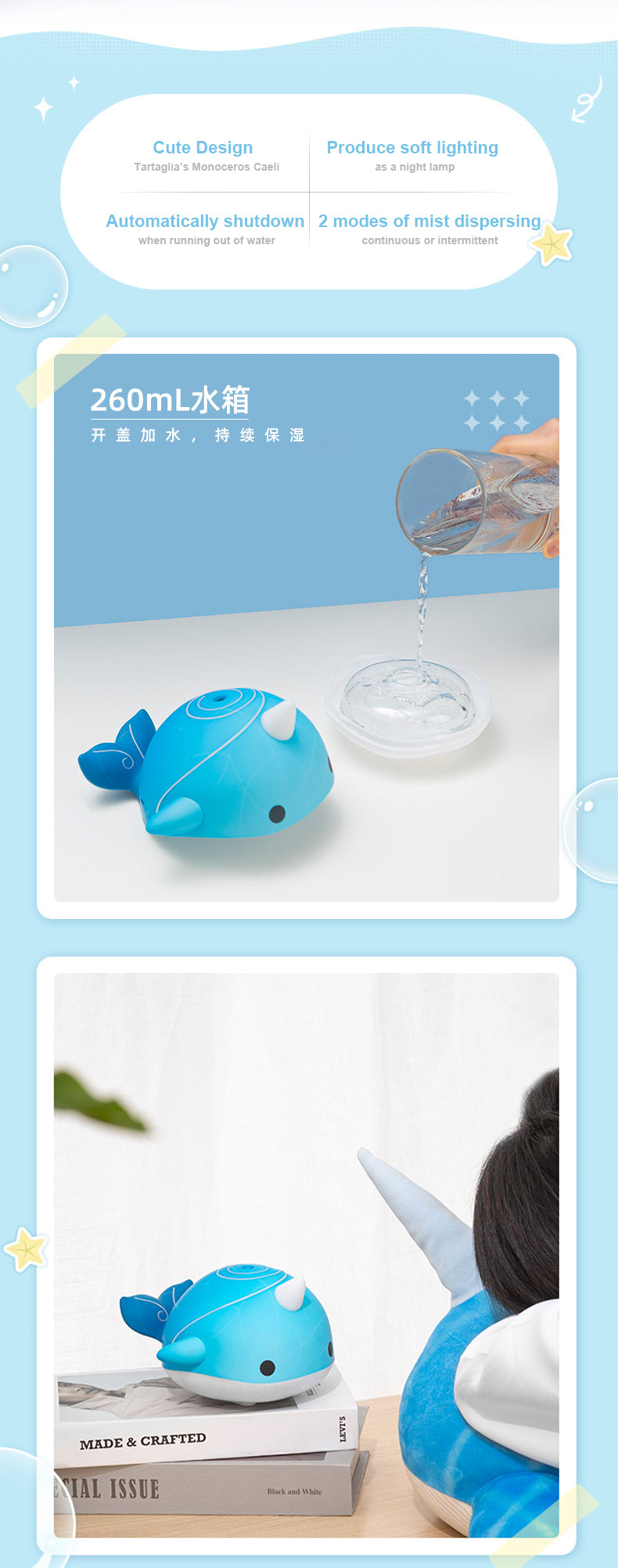 Tartaglia Whale Monoceros Caeli Humidifier, with 260ml capacity, seamlessly combining lightweight portability with extended usage. Equipped with the mainstream Type-C socket for easy battery life, it also incorporates an ambient light design. Choose from multiple modes, including non-light continuous spray mode, light continuous spray mode, light intermittent spray mode Enjoy a peaceful and moist environment while working and studying. The delicate touch and cute design accompany you throughout.