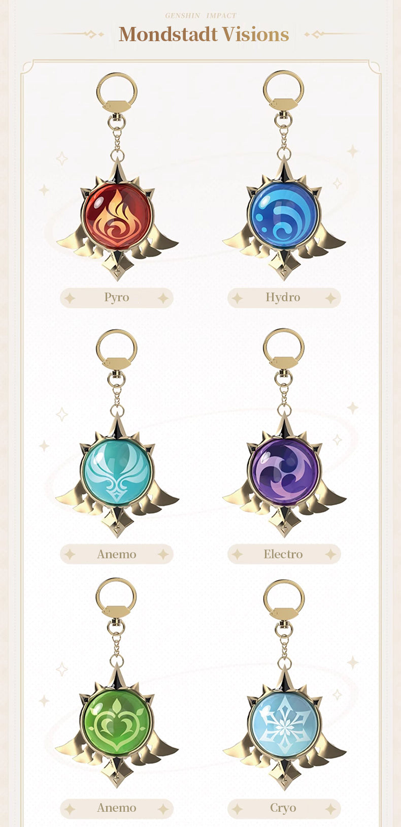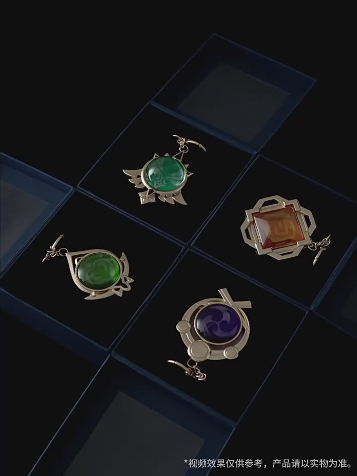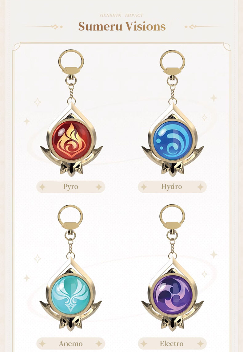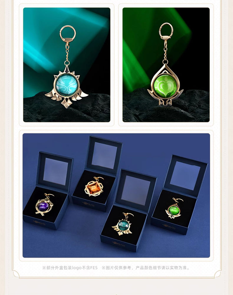 Delicate keychain charm featuring seven unique Elemental Visions from Genshin Impact Mondstadt, Liyue, Inazuma and Sumeru, perfect for cosplay or as a backpack accessory.